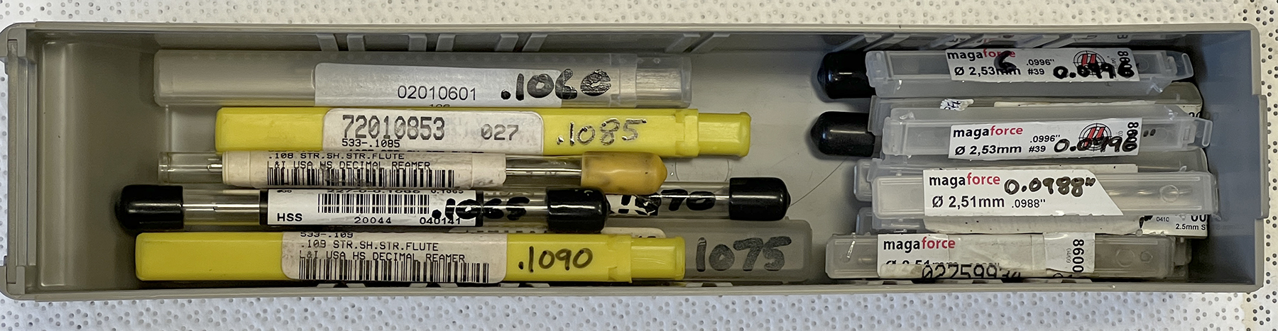 As a possibly-relevant aside, I already noted in a previous post that Mikuni's needle jets are spaced every 0.0002", indicating that changes at a level of ~0.0001" have a measurable effect. Motivated by that, plus having assembled an instrumentation package for measuring air/fuel ratios, some years ago I decided to see if I could control a carburetor even better by making my own needle jets. Better, at least, for the short time before wear reared its ugly head. As the next photograph shows, I have a drawer filled with drill bits and reamers from that time.