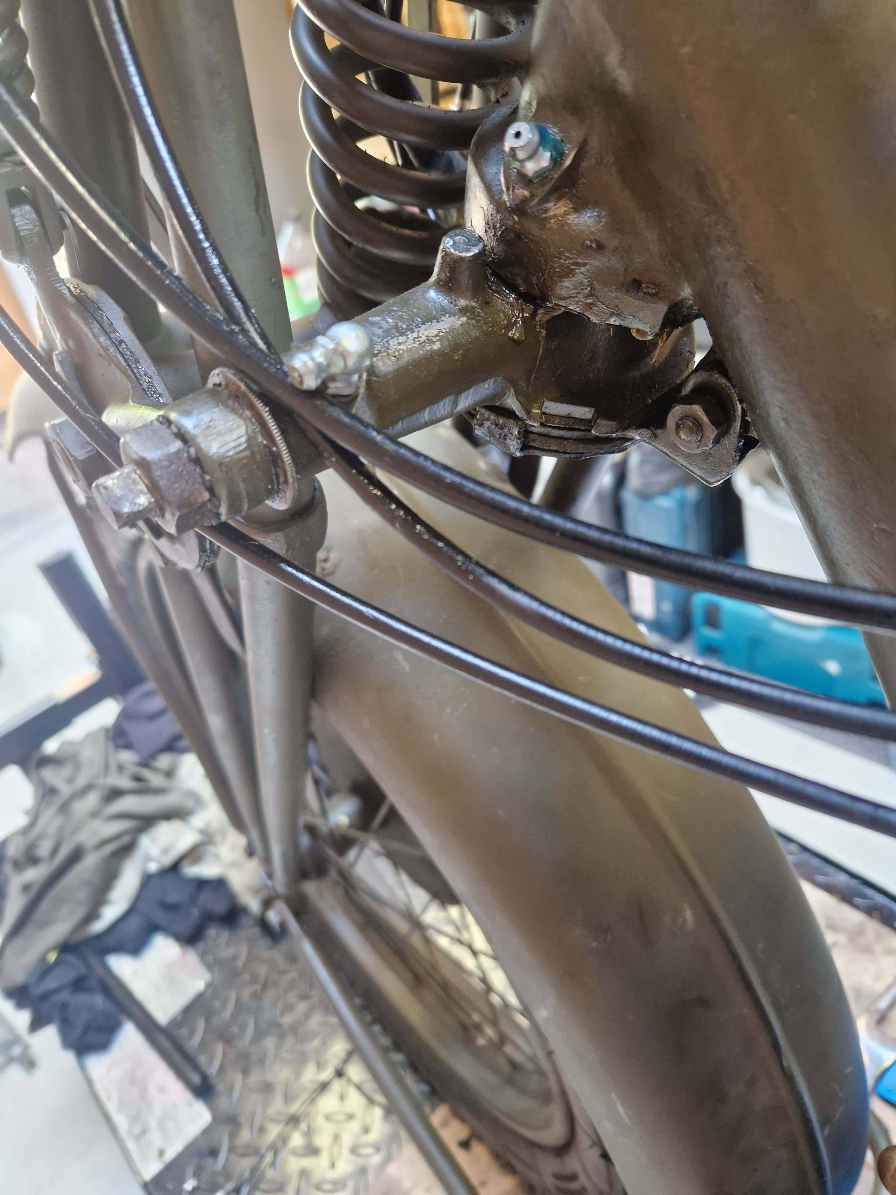 I had to do some work before taking her out. I recieved some new tankrubbers from Austria and while fitting them I noticed both the grease nipples of the bottom yoke were hitting the tank on the maximum steering angle. At first I thought it was due to heavy wear, but after looking at the workplace manual I noticed the previous owner had put it in the wrong way around. So that was a fun job. Luckily I had some spare bearing balls.