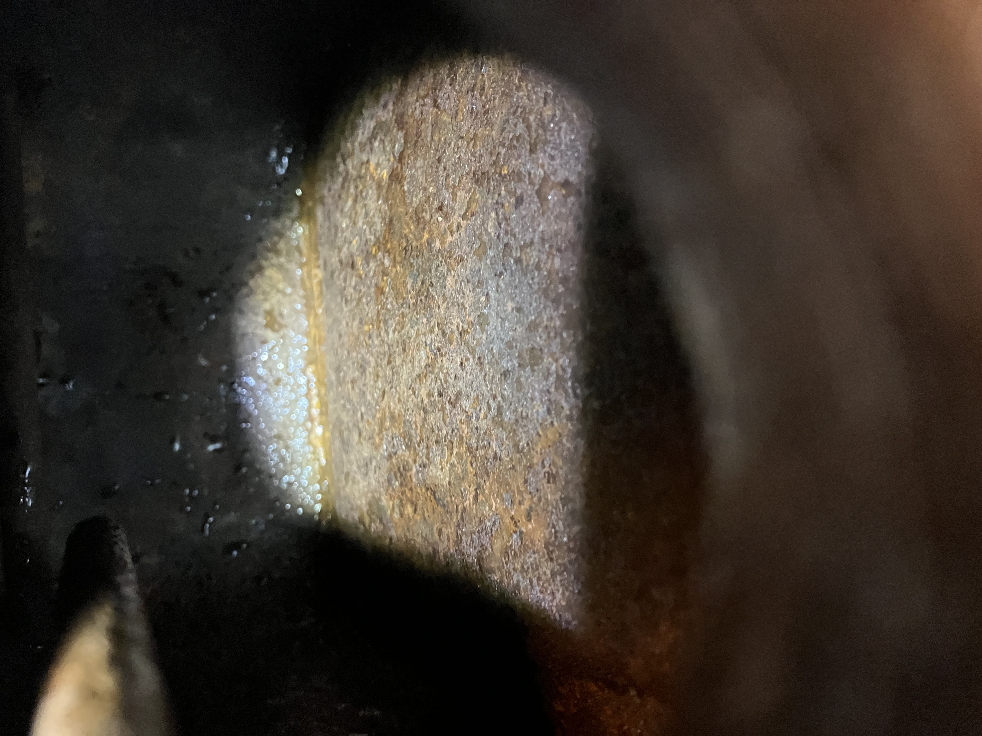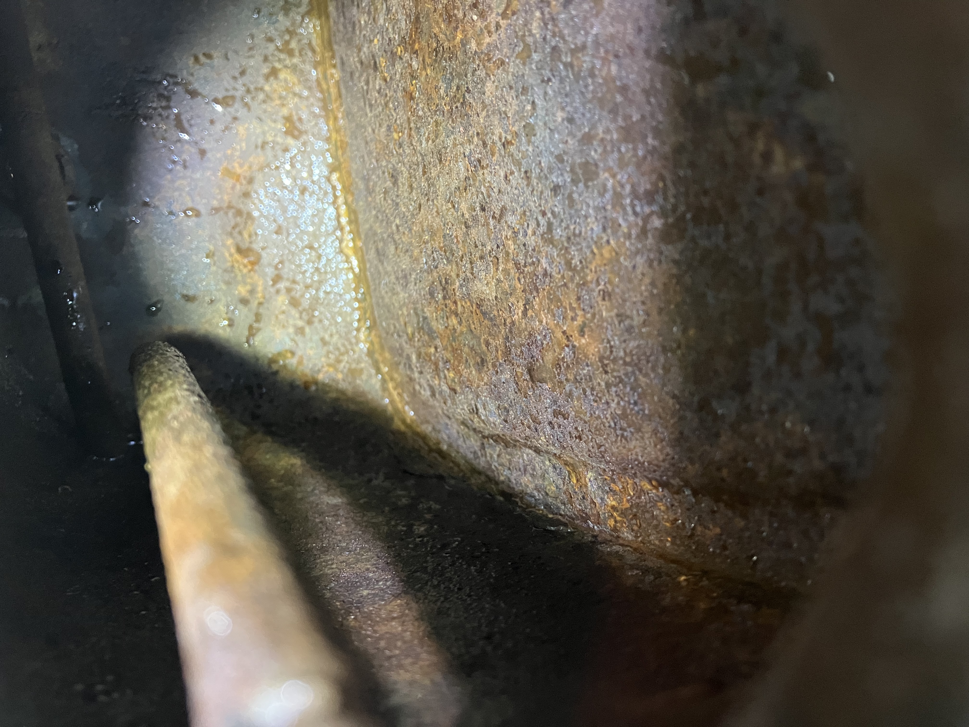 Pitting from the inside is pretty common.The water is more dense than oil and stays on the bottom under the muck. Old oil has acids in it that combine with water. Nev