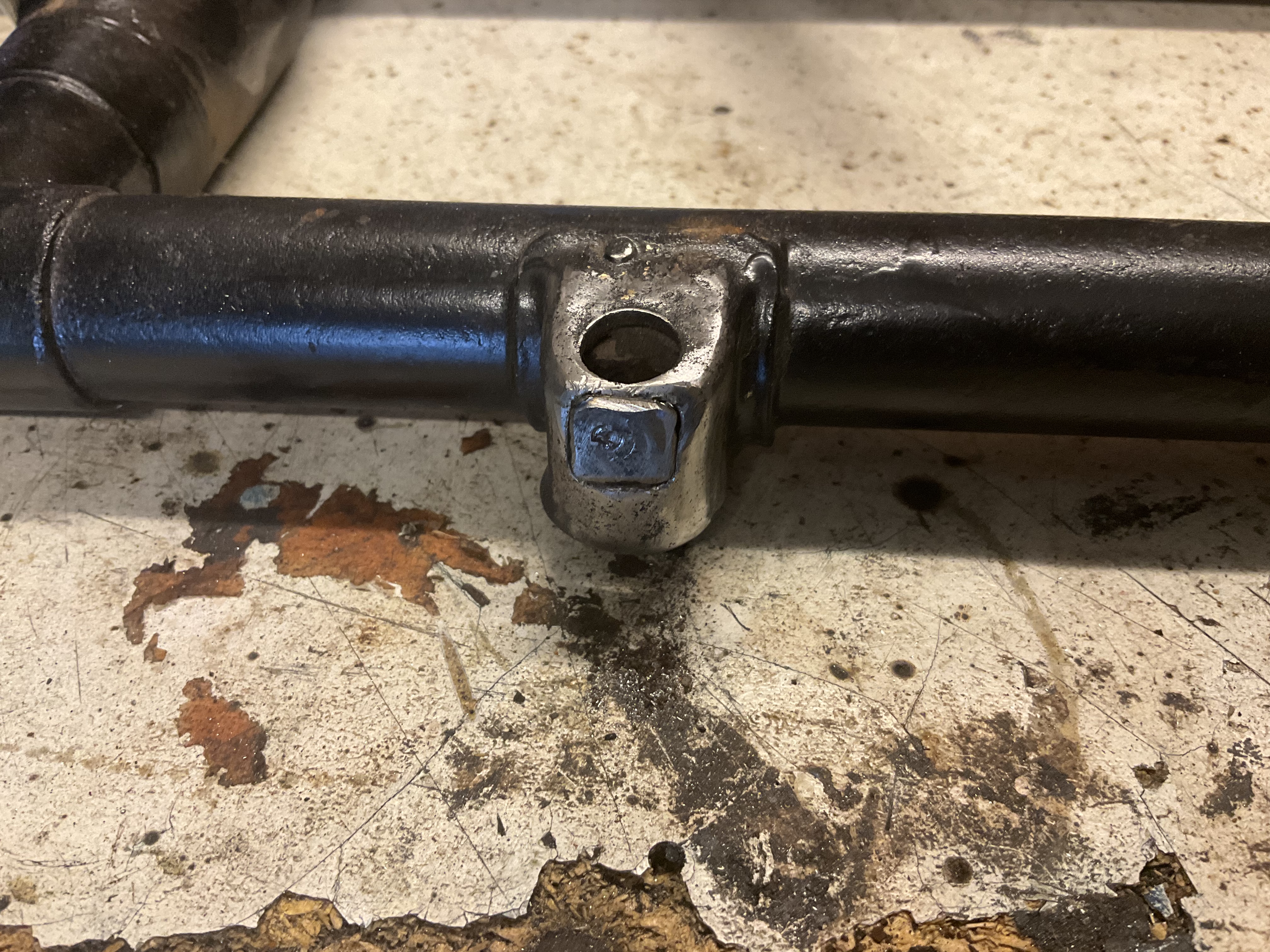 Got a couple of jobs done on the frame today, I found a broken bolt on what I believe to be a primary case mount on the lower left side on the frame, was a sod to get out but got him in the end. Also patched up a hole on what I believe is called the breather bracket on the lower right side, not sure how it got there..looked like gravel rash.